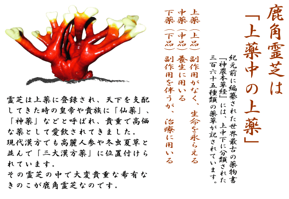 鹿角霊芝は上薬中の上薬。紀元前に編纂された世界最古の薬物書『神農本草経』には、上中下に分類された三百六十五種類の薬草が記されています。霊芝は上薬に登録され天下を支配してきた時の皇帝や貴族に「仙薬」、「神薬」などと呼ばれ貴重で高価な薬として愛飲されてきました。現代漢方でも高麗人参や冬虫夏草と並んで「三大漢方薬」に位置付けられています。その霊芝の中で大変貴重な希有なきのこが鹿角霊芝なのです。